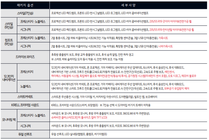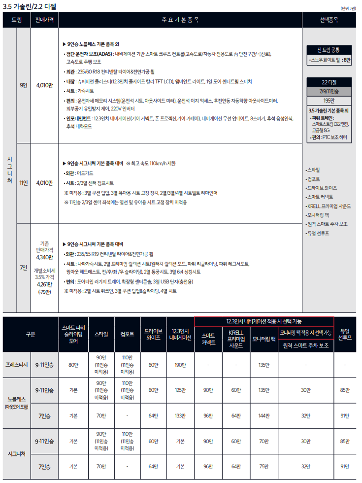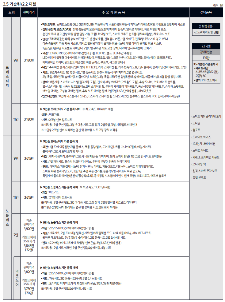 기아 카니발은 기능성과 고급스러움을 향상시키는 다양한 선택적 추가 항목을 제공합니다. 이에는 듀얼 선루프, KRELL 프리미엄 사운드 시스템, 그리고 Drive Wise 첨단 운전자 지원 시스템이 포함됩니다. 카니발의 가격은 3.5 가솔린 프레스티지 9인승 모델의 경우 31,800,000원부터 시작합니다. 2.2 디젤 7인승 리무진 모델은 3,870에서 4,381만원 사이이며, 3.5 가솔린 11인승 모델은 3,180에서 4,010만원 사이입니다.